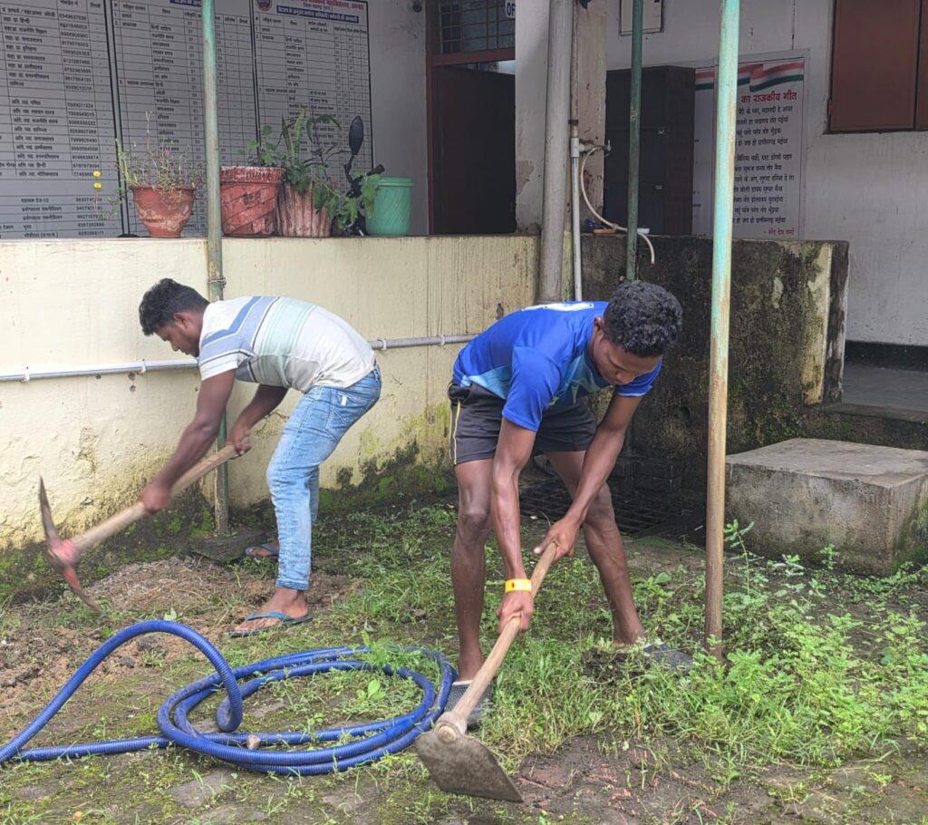 रायगढ़ तमनार । शहीद नंदकुमार पटेल विश्वविद्यालय रायगढ़ से सम्बध्द राष्ट्रीय सेवा योजना इकाई शासकीय महाविद्यालय तमनार के 20 स्वयंसेवकों ने रविवार की सुबह हिन्दी दिवस के अवसर पर श्रमदान करते हुए सर्वप्रथम महाविद्यालय परिसर के कबड्डी मैदान की साफ़ सफाई की तत्पश्चात क्यारी निर्माण हेतु मिट्टी की खुदाई कर क्यारी में फूल लगाने हेतु मिट्टी एवं क्यारी के सीमांकन हेतु ईंट ढुलाई का कार्य किया। क्यारी निर्माण के पश्चात स्वयंसेवकों द्वारा गुलाब के पौधे लगाए गए। कार्यक्रम अधिकारी श्री कमल यशवंत सिन्हा ने स्वयंसेवकों को स्वच्छता एवं वृक्षारोपण के महत्व के विषय में जानकारी दी।