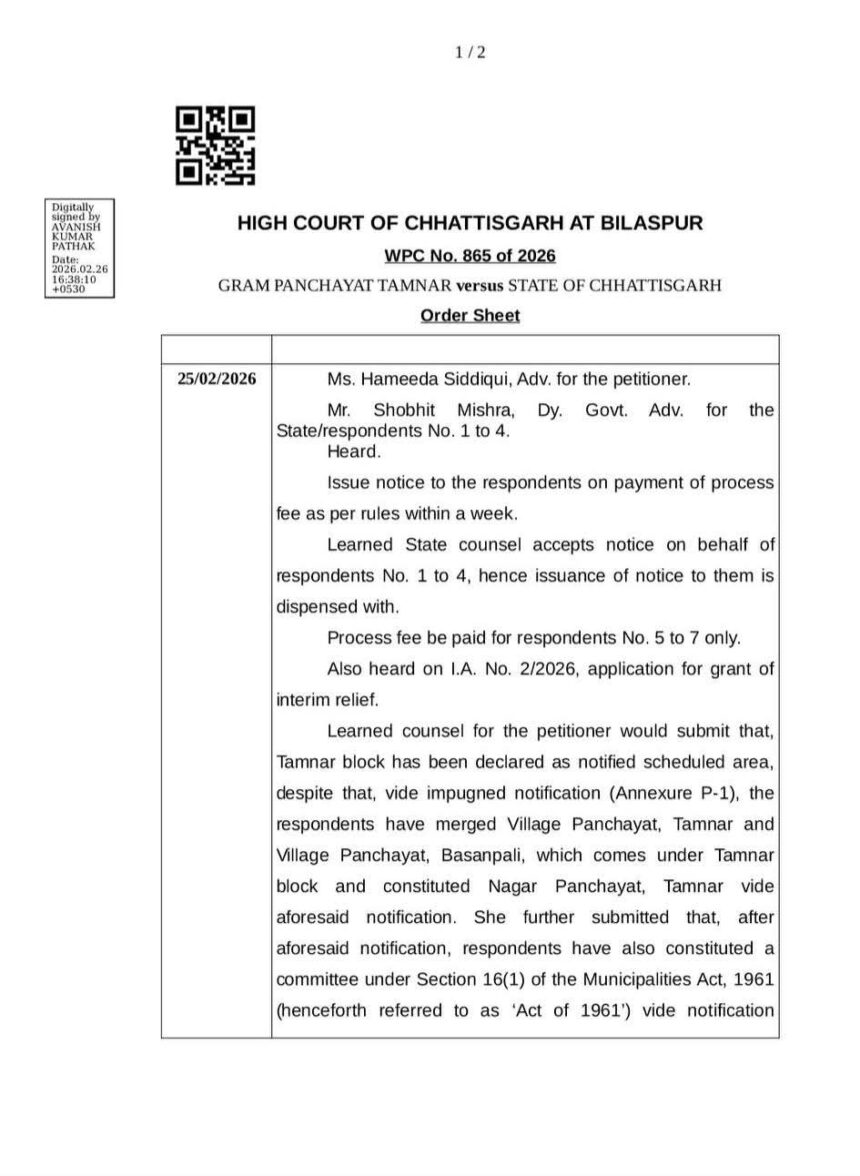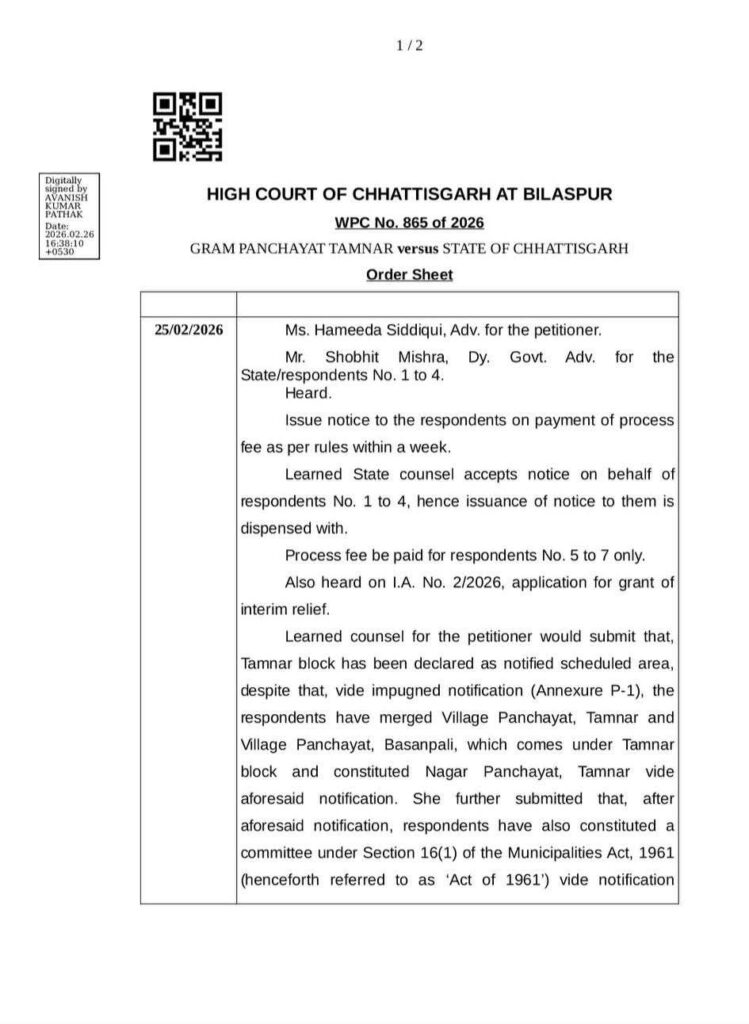 रायगढ़/बिलासपुर।तमनार को नगर पंचायत के रूप में गठित करने की प्रक्रिया पर छत्तीसगढ़ हाई कोर्ट ने बड़ा हस्तक्षेप करते हुए संबंधित अधिसूचना के प्रभाव और संचालन पर अंतरिम रोक लगा दी है। अदालत के इस आदेश से नगर पंचायत गठन के बाद बनाई गई समिति की कार्यवाही फिलहाल स्थगित हो गई है और मौजूदा ग्राम पंचायत को अपना कामकाज जारी रखने की अनुमति मिल गई है।