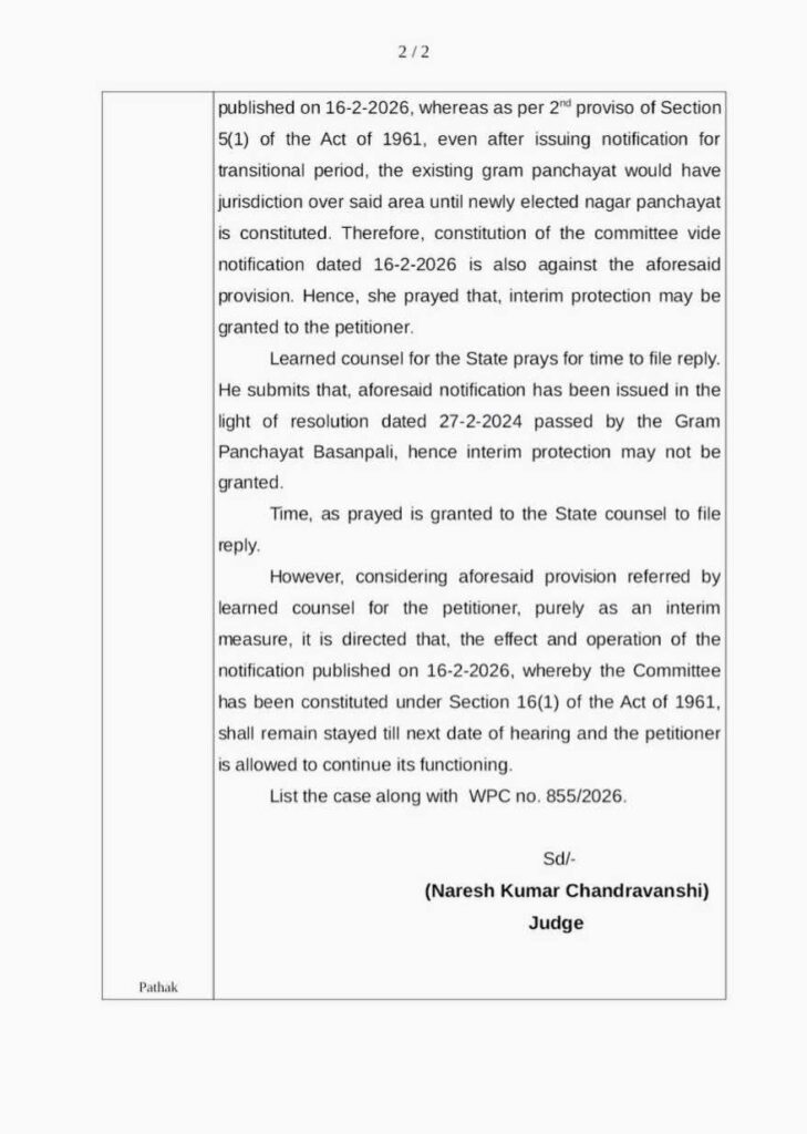 अदालत के समक्ष यह भी तर्क रखा गया कि अधिसूचना जारी होने के बाद भी संक्रमण काल में जब तक नई नगर पंचायत का निर्वाचन नहीं हो जाता, तब तक संबंधित क्षेत्र पर ग्राम पंचायत का ही अधिकार बना रहता है। इसी आधार पर अधिसूचना दिनांक 16 फरवरी 2026 के जरिए गठित समिति को चुनौती देते हुए अंतरिम संरक्षण की मांग की गई।