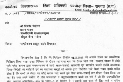 रायगढ़ सरकारी स्कूल के मिड डे भोजन में मिला कीड़ा: हेड मास्टर को नोटिस, घरघोड़ा का मामला
