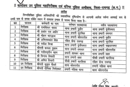 रायगढ़ जिले में पुलिस विभाग में बड़ा फेरबदल, कई थाना प्रभारियों के तबादले